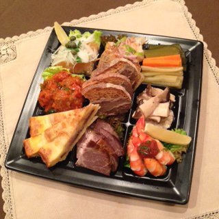 | 生キングサーモンのマリネ 島原名水鶏のローストマリネ 自家製のピクルス 小さなハンバーグトマトソース 長州鶏レバーペースト,オレンジ風味 エリンギマリネ キィシュロレーヌ 黒豚肩ロースの自家燻製ハム 小海老のカクテルソース添え |